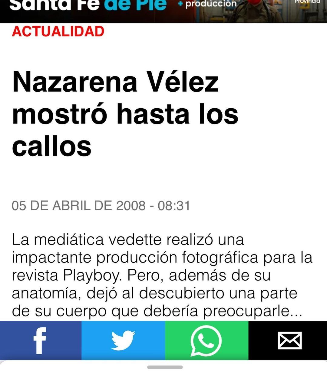 En su reflexión, Nazarena recordó las críticas que padeció en 2008 al protagonizar una tapa de la revista Playboy. “Hasta los pies me criticaron”, recriminando lo que un portal de Santa Fe había publicado en aquella ocasión. "Nazarena Vélez mostró hasta los callos", había titulado en ese momento el medio santafesino.