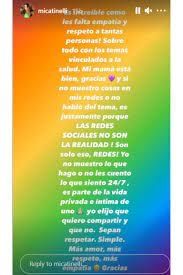 Finalmente, Mica sentenció: “Yo no muestro lo que hago o no les cuento lo que siento 24/7. Es parte de la vida privada e íntima. Yo elijo qué quiero compartir y qué no. Sepan respetar. Simple. Más amor, más respeto y más empatía”.