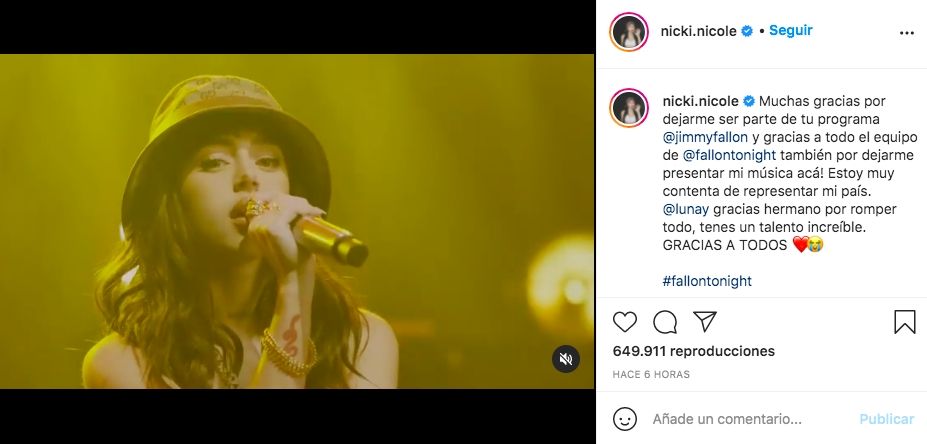 Más tarde, publicó en su cuenta de Instagram un video del show y se mostró agradecida por la experiencia que vivió. "Muchas gracias por dejarme ser parte de tu programa @jimmyfallon. ¡Y gracias a todo el equipo de @fallontonight también por dejarme presentar mi música acá! Estoy muy contenta de representar mi país. @lunay gracias, hermano por romper todo, tenes un talento increíble. Gracias a todos".