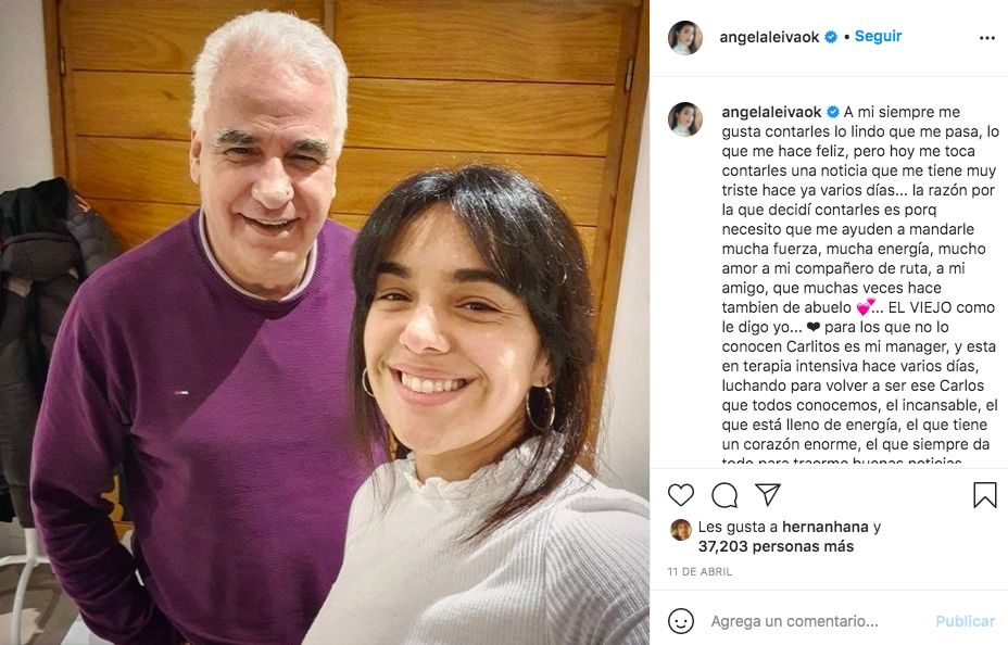 "Para los que no lo conocen Carlitos es mi manager, y esta en terapia intensiva hace varios días, luchando para volver a ser ese Carlos que todos conocemos, el incansable, el que está lleno de energía, el que tiene un corazón enorme, el que siempre da todo para traerme buenas noticias... viejo querido ponete bien que tu familia y nosotros te extrañamos y te necesitamos acá, más fuerte que nunca", agregó Ángela.