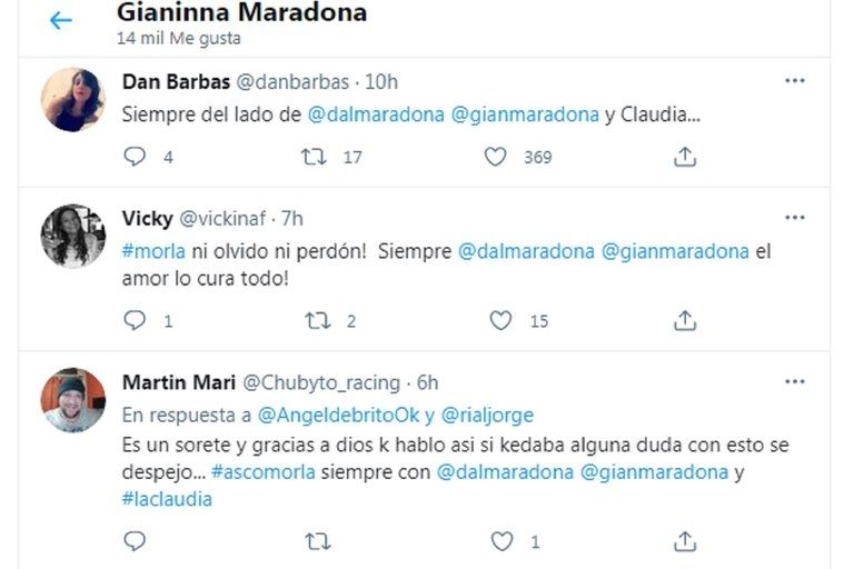Luego de ver la entrevista, Dalma se expresó a través de su cuenta de Twitter. No lo hizo con sus propias palabras, sino que se limitó a darle "me gusta" a determinados comentarios que recibió en su red social por parte de distintos usuarios.