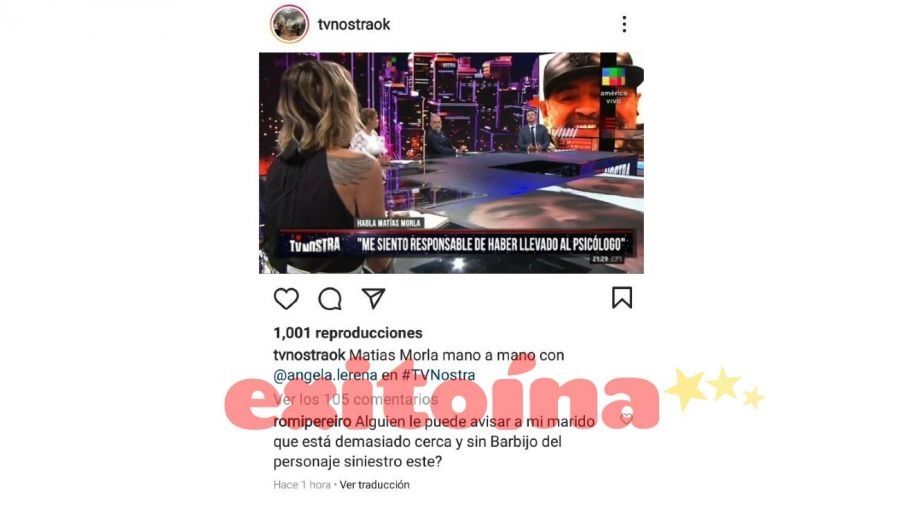 "¿Alguien le puede avisar a mi marido que está demasiado cerca y sin barbijo del personaje siniestro este?" , escribió la esposa del conductor en la cuenta de Instagram de TV Nostra. Sin embargo, unos minutos después, la nutricionista retrocedió y optó por borrar el mensaje.