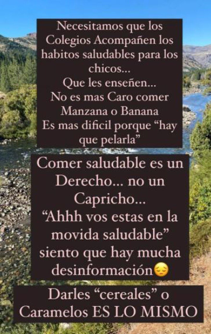 Para aquellos que la criticaron por su descargo, la modelo respondió categórica: “Creo que hay mucha desinformación. Darles ‘cereales’ o caramelos es lo mismo”. Luego, compartió una publicación de una nutricionista y reveló que tuvo que presentar un certificado médico en la escuela de sus hijos para que le permitieran mandarles frutas en lugar de galletitas u otros productos azucarados.
