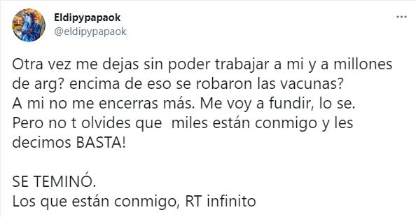 "No me vas a encerrar otra vez", decía la placa que publicó el músico de de cumbia. "¿Otra vez me dejas sin poder trabajar a mi y a millones de argentinos? ¿Encima de eso se robaron las vacunas? A mi no me encerras más. Me voy a fundir, lo sé. Pero no te olvides que miles están conmigo y les decimos basta, se terminó. Los que están conmigo, RT infinito", comentó pidiendo el apoyo de sus seguidores.