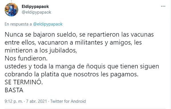 Luego criticó a toda el ala política: "Nunca se bajaron sueldo, se repartieron las vacunas entre ellos, vacunaron a militantes y amigos, les mintieron a los jubilados. Nos fundieron. Ustedes y toda la manga de ñoquis que tienen siguen cobrando la platita que nosotros les pagamos. Se terminó. Basta. Así empezaron el año pasado. 15 días que se convirtieron en 9 meses. Pero a Cristina le devolvieron todos sus bienes, más jubilación privilegio y nosotros fundidos. Se robaron la única esperanza que tiene el planeta contra el COVID: las vacunas. A mi no me encierran nunca mas".