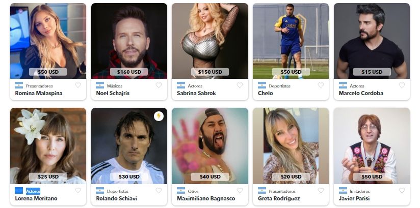 Si ingresamos al portal, podemos encontrar desde la modelo, ex Gran Hermano y presentadora de noticias Romina Malaspina, pasando por el actor Osvaldo Laport y la influencer Tamara Bella. En total hay más de setenta famosos argentinos que brindan este servicio con montos que rondan los 5 y los 150 dólares.