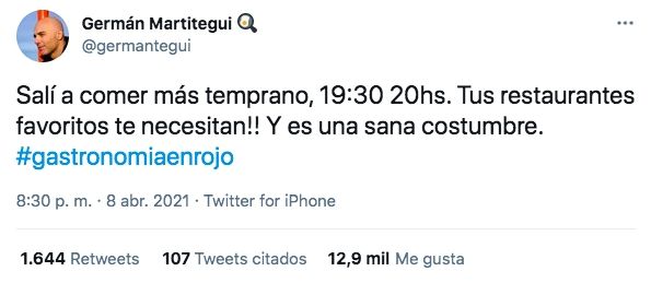 "Salí a comer más temprano, 19:30 20hs. ¡Tus restaurantes favoritos te necesitan! Y es una sana costumbre", escribió el cocinero y jurado de MasterChef Celebrity en su cuenta de Twitter. Luego, agregó el hashtag "gastronomía en rojo".