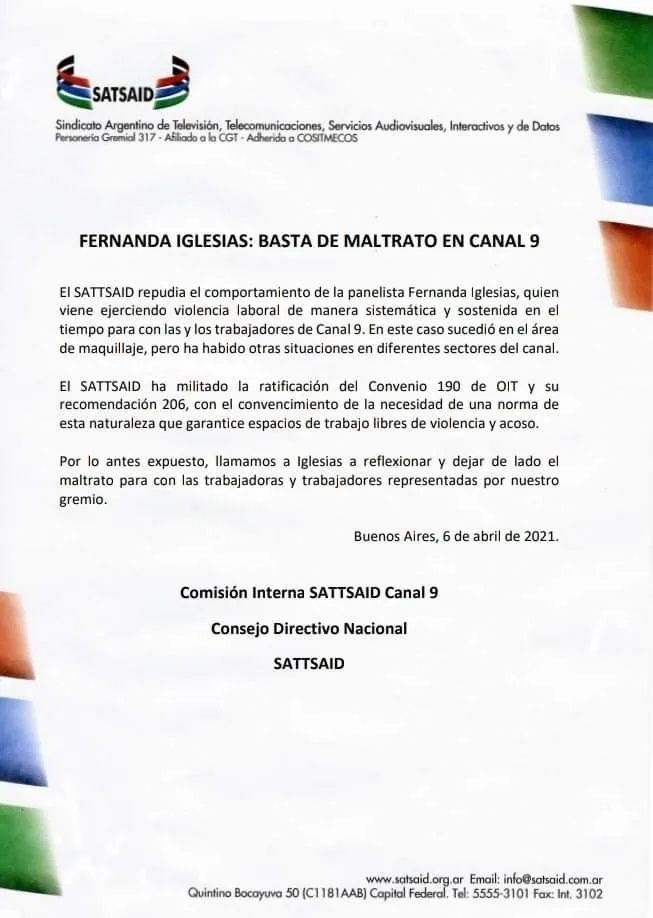 "Fernanda Iglesias: Basta de maltrato en Canal 9", es como titularon el comunicado. "El SATTSAID repudia el comportamiento de la panelista Fernanda Iglesias, quien viene ejerciendo violencia laboral de manera sistemática y sostenida en el tiempo para con las y los trabajadores de Canal 9. En este caso sucedió en el área de maquillaje, pero ha habido otras situaciones en diferentes sectores del canal", detallaron.