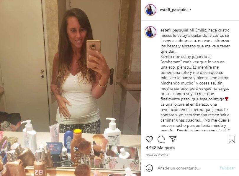 "Siento que estoy jugando al 'embarazo' cada vez que lo veo en una eco. Pienso 'es mentira, me ponen una foto y me dicen que es mío'. Veo la panza y pienso 'me estoy hinchando mucho' y cosas así, sin mucho sentido. Pero es que no caigo, no se cuándo voy a creer que finalmente pasó, que está conmigo", continuó.