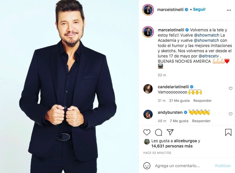 Ahora, Marcelo confirmó la fecha de regreso en sus redes sociales: "Volvemos a la tele y estoy feliz!! Vuelve @showmatch La Academia y vuelve @showmatch con todo el humor y las mejores imitaciones y sketchs. Nos volvemos a ver desde el lunes 17 de mayo por @eltrecetv . BUENAS NOCHES AMERICA", escribió el conductor.