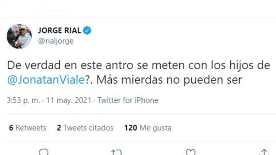 "¿De verdad en este antro se meten con los hijos de @JonatanViale? Más mierdas no pueden ser", comentó el conductor a través de Twitter, donde el nombre de Jonatan Viale se convirtió en tendencia durante la jornada.