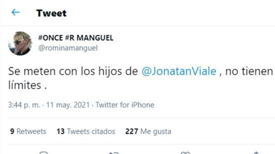 Romina Manguel también se solidarizó con el conductor de LN+ y manifestó su repudio a los intolerantes. "Se meten con los hijos de @JonatanViale, no tienen límites", escribió la periodista.