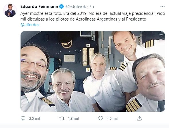 "Ayer mostré esta foto. Era del 2019. No era del actual viaje presidencial. Pido mil disculpas a los pilotos de AerolíneasArgentinas y al Presidente @alferdez", publicó.