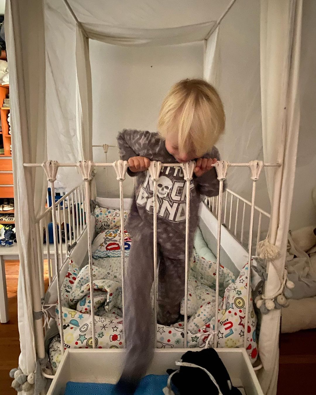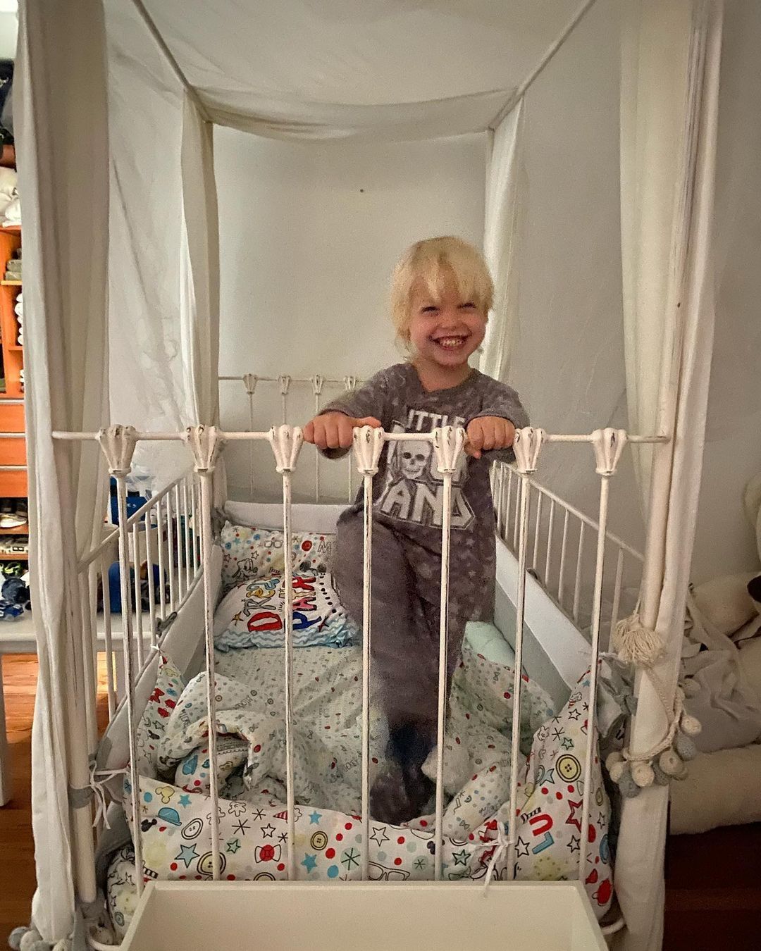 "¿A que no adivinan a quien encontré tratando de escapar de su cama? Es la cuna que le regaló la tía Su pero ya pronto pasaremos a una cama normal. Igual durante la noche aparece dado vuelta, con la cabeza donde van los pies, lo giro y al rato gira de nuevo. En una cama sin barras va a terminar en el piso seguro, pero bue, crece tan rápido que ya pronto habrá cambio de cama", escribió Marley en junto con dos fotos del pequeño, que en octubre cumplió tres años, parado sobre su cuna.