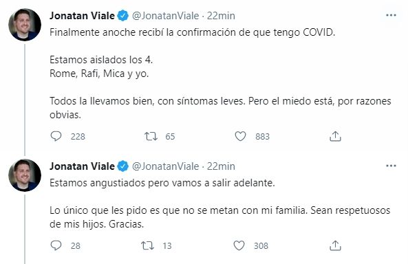 Además, y a pesar de que el presentador de televisión y radio no quería que se hiciese público que sus hijos se contagiaron, le dedicó un tuit a Eduardo Feinmann, quien fue el encargado de dar la noticia en la señal de noticias de La Nación.
