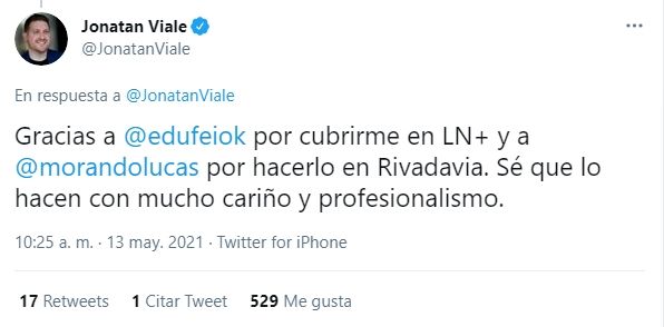 "Gracias a @edufeiok por cubrirme en LN+ y a @morandolucas (Lucas Morando) por hacerlo en Rivadavia. Sé que lo hacen con mucho cariño y profesionalismo", aseguró el periodista.