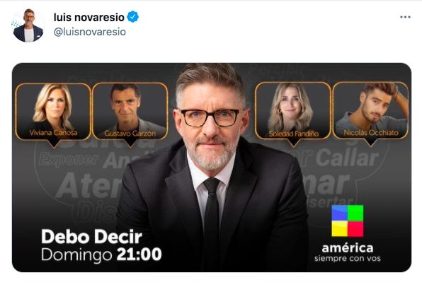 Luis Novaresio confirmó en sus redes sociales los invitados que estarán presentes este domingo a las 21 hs en su programa Debo Decir por la pantalla de América.