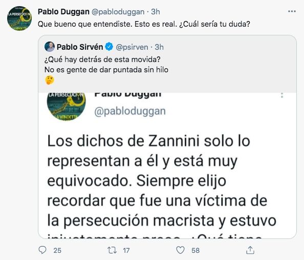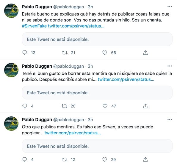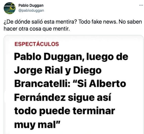 En la mañana, Pablo Duggan fue tendencia nacional de Twitter, tras circular de manera viral la captura de una nota cuyo título era "Pablo Duggan, luego de Jorge Rial y Diego Brancatelli: 'Si Alberto Fernández sigue así, todo puede terminar mal'".