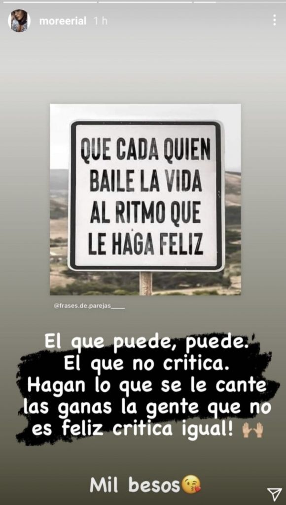 "Qué cada quien baile la vida el ritmo que le haga feliz", expresa la foto que compartió. Y sin nombrarlo, agregó un fuerte mensaje, claramente, en defensa del conductor. "El que puede, puede. El que no, critica. Hagan lo que se les cante las ganas, la gente que no es feliz critica igual. Mil besos", sentenció More, quien atraviesa un buen momento en su relación con Jorge tras varios conflictos en el pasado.