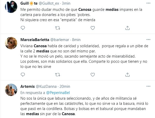 Las declaraciones de la periodista sobre esta forma de realizar actos solidarios despertaron el enojo en las redes sociales. Rápidamente, miles de burlas colmaron Twitter e incluso muchos usuarios la compararon con Micky Vainilla, el personaje de ideología nazi creado e interpretado por Diego Capusotto.