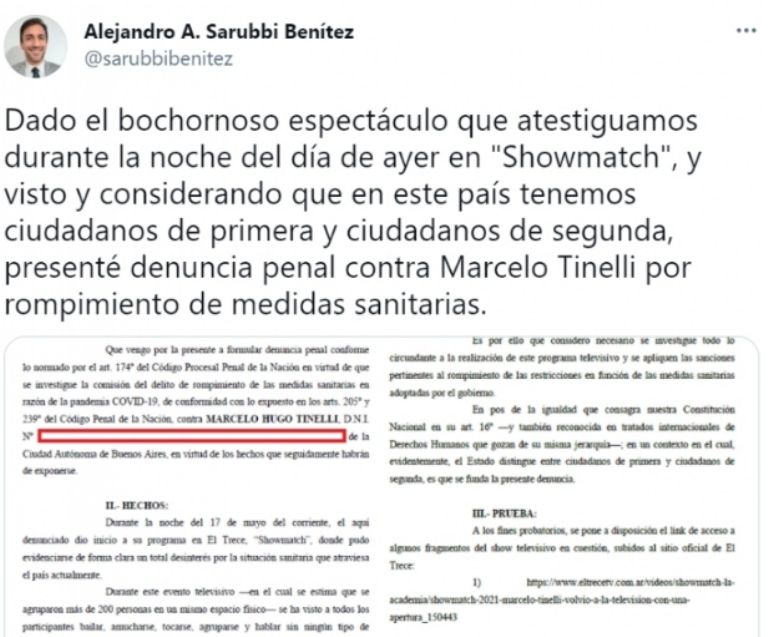 "Dado el bochornoso espectáculo que atestiguamos durante la noche y visto y considerando que en este país tenemos ciudadanos de primera y ciudadanos de segunda, presenté una denuncia penal contra Marcelo Tinelli por rompimiento de medidas sanitarias", escribió el letrado.