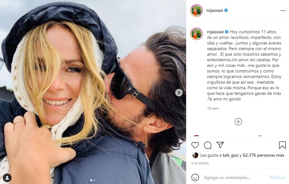 Mientras que el pasado 5 de enero, Rojas publicó un mensaje de amor para celebrar un nuevo aniversario y se refirió a sus peleas y reconciliaciones. "Hoy cumplimos 11 años de un amor revoltoso, imperfecto, con idas y vueltas, juntos y algunas veces separados. Pero siempre con el mismo amor. El que solo nosotros sabemos y entendemos. Un amor sin caretas. Por eso y mil cosas más, me gusta lo que somos, lo que construimos y como siempre logramos reinventarnos. Estoy orgullosa de que así sea, inestable como la vida misma. Porque eso es lo que hace que tengamos ganas de más. Te amo mi gordo".