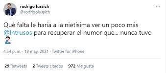 Lejos de retroceder frente a la negativa de la nieta de Mirtha Legrand, el co-conductor de Intrusos le dedicó un filoso tuit. “Qué falta le haría a la nietísima ver un poco más de Intrusos para recuperar el humor… que nunca tuvo”, escribió el periodista.