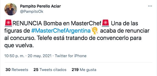 Luego, el periodista Pampito habló de una posible renuncia, aunque sin nombrar al hermano de Charlotte: "RENUNCIA Bomba en MasterChef. Una de las figuras de #MasterChefArgentina acaba de renunciar al concurso. Telefe está tratando de convencerlo para que vuelva".