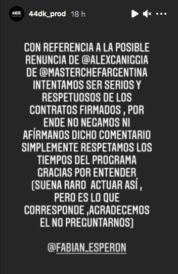 Por su parte, desde 44 DK, la productora que representa al artista, publicaron un ambiguo comunicado en sus redes sociales sobre lo sucedido: " Con referencia a la posible renuncia de Alex Caniggia a MasterChef Celebrity intentamos intentamos ser serios y respetuosos de los contratos firmados, por ende no negamos ni afirmamos dichos comentarios, simplemente respetamos los tiempos del programa. Gracias por entender. Suena raro actuar así, pero es lo que corresponde. Agradecemos el no preguntarnos", dicta el posteo firmado por Fabián Esperón.