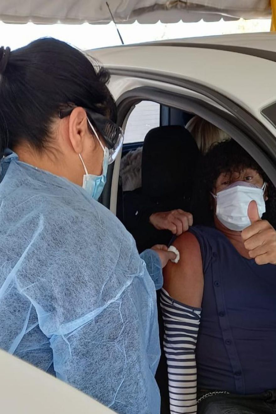 Cuando una enfermera se acercó a la ventanilla para aplicarle la última dosis de la vacuna, La Mona sorprendió desprendiéndose una manga retirable con estampa rayada. Una indumentaria muy práctica para pasar rápido por el puesto, sin demoras a la hora de quitarse alguna prenda.