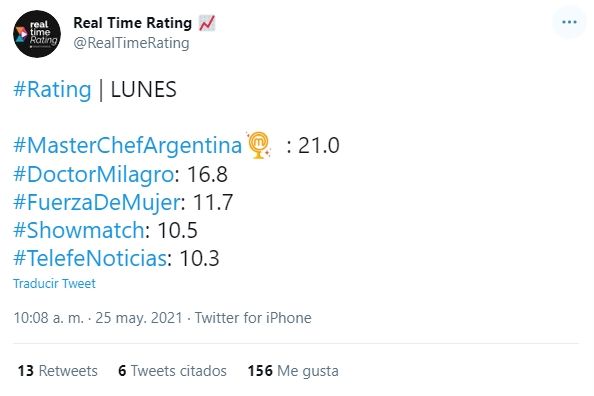 Según las estadísticas de la empresa Kantar Ibope Media, la megaproducción que conduce Tinelli promedió los 10.5. Si bien fue su rating más bajo, también fue lo que mejor midió en el canal del sol durante la jornada. El certamen de cocina, en la vereda opuesta, lo duplicó y marcó 21 puntos. Una hora antes y en la misma emisora, Doctor milagro hacía 16.8 puntos.