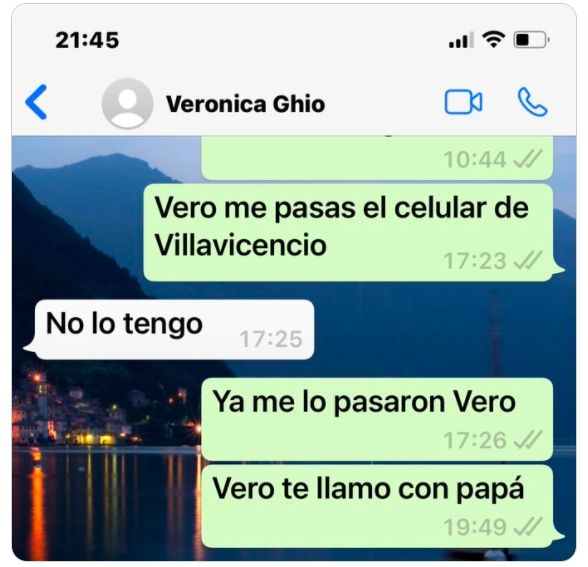 "Lamentablemente tengo que hacer un Twitter porque NO tengo noticias de mi papá desde que salió del Sanatorio, no responde su celular, no atiende en la puerta y Veronica Ghio nos bloqueó a mi hermana y a mí", denunció, acompañando sus dichos con la captura de pantalla de un chat en el que se lee un diálogo con Ghio.