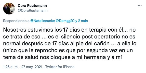 "Nosotros estuvimos los 17 días en terapia con él... No se trata de eso. Es el silencio post operatorio, no es normal después de 17 días al pie del cañón... A ella lo único que le reprocho es que por segunda vez en un tema de salud nos bloquee a mi hermana y a mí", señaló Cora. Además, dijo que piensa volver a golpear la puerta de su papá a la espera de que la dejen entrar. "Esta vez (voy a ir) con su nieto", avisó.