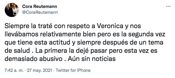 "Siempre la traté con respeto a Veronica y nos llevábamos relativamente bien pero es la segunda vez que tiene esta actitud y siempre después de un tema de salud . La primera la dejé pasar pero esta vez es demasiado abusivo . Aún sin noticias", escribió hace minutos.