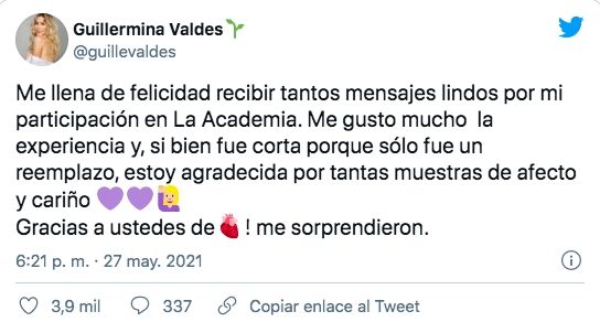 Recordemos que más temprano, Guillermina se había explayado en Twitter sobre esta última jornada: "Me gustó mucho la experiencia y, si bien fue corta porque sólo fue un reemplazo, estoy agradecida por tantas muestras de afecto y cariño. Me sorprendieron".