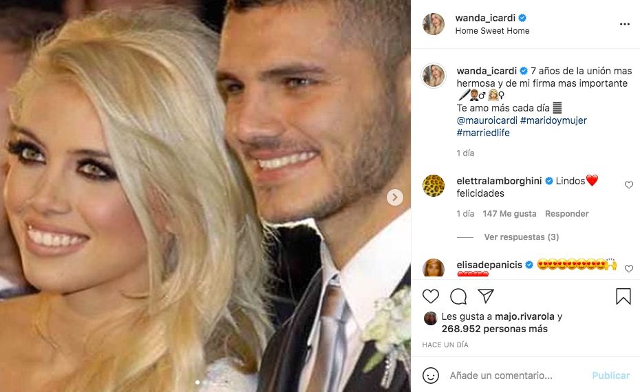 El jueves pasado Wanda Nara y Mauro Icardi cumplieron siete años de matrimonio. La pareja lo celebró compartiendo postales de ese inolvidable día en su cuenta de Instagram. "La unión más hermosa y de mi firma más importante", escribió la empresaria.