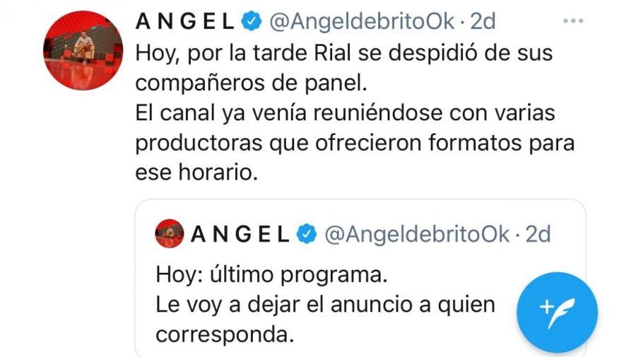 El conductor ya había preanunciado la baja del ciclo de su colega a través de Twitter antes de que se hiciera el anuncio oficial. “Hoy: último programa. Le voy a dejar el anuncio a quien corresponda”, indicó inicialmente De Brito. Luego agregó: “Hoy por la tarde Rial se despidió de sus compañeros de panel. El canal ya venía reuniéndose con varias productoras que ofrecieron formatos para ese horario”.