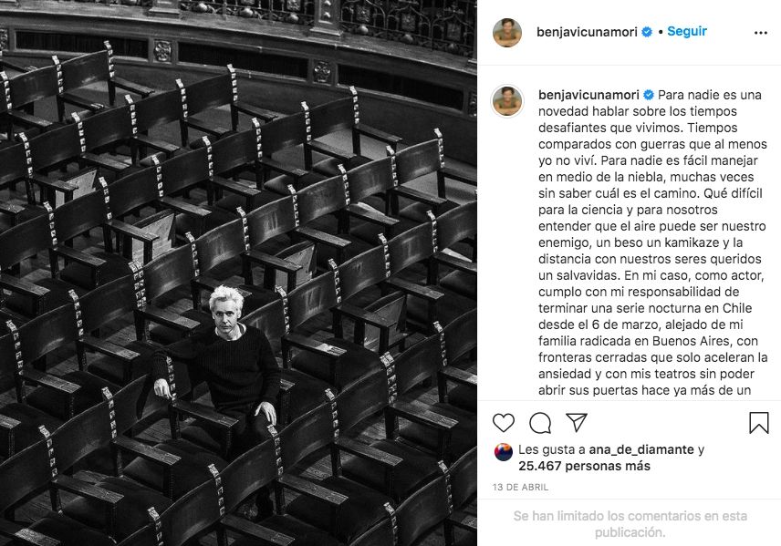 Luego, explicó su situación particular: "Como actor, cumplo con mi responsabilidad de terminar una serie nocturna en Chile desde el 6 de marzo, alejado de mi familia radicada en Buenos Aires, con fronteras cerradas que solo aceleran la ansiedad y con mis teatros sin poder abrir sus puertas hace ya más de un año".
