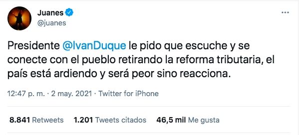 Por su parte, Juanes decidió publicar su opinión en su cuenta de Twitter el día domingo: "Presidente Iván Duque, le pido que escuche y se conecte con el pueblo retirando la reforma tributaria, el país está ardiendo y será peor si no reacciona".