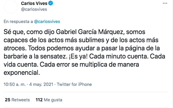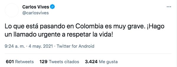 "Lo que está pasando en Colombia es muy grave. ¡Hago un llamado urgente a respetar la vida!", escribió hace minutos Carlos Vives en su cuenta de Twitter.