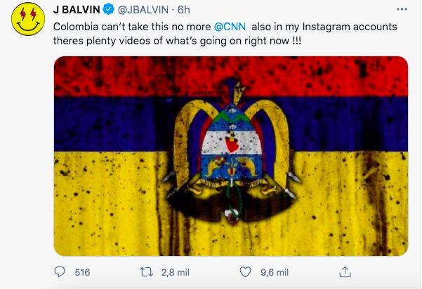 El reggaetonero J Balvin también hizo su denuncia, mencionando a la cadena CNN en su mensaje: "Colombia no puede soportar esto más @CNN. También en mis cuentas de Instagram hay muchos videos de lo que está pasando ahora mismo".