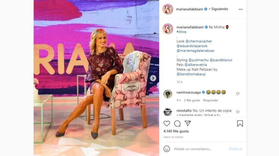 Tras unos días de silencio, Fabbiani esperó la oportunidad para responder, y ahora lo hizo a través de un posteo en su cuenta de Instagram donde se la ve sentada en un elegante sillón del estudio de su programa, al lado de unas flores “Re Mirtha, ahre”, escribió en el epígrafe de la publicación junto con el emoji de una rosa.