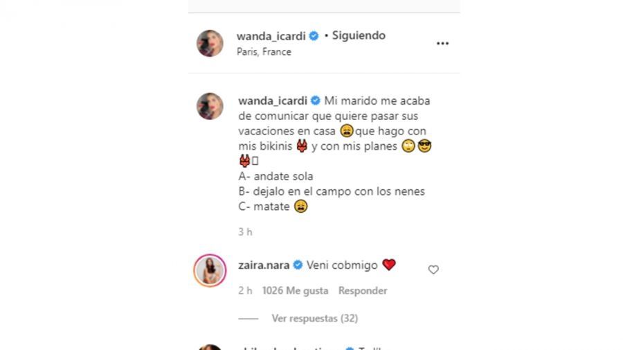 "Mi marido me acaba de comunicar que quiere pasar sus vacaciones en casa. ¿Qué hago con mis bikinis y con mis planes? A) Andate sola. B) Dejalo en el campo con los nenes. C) Matate", redactó indignada la empresaria que acompañó el texto con una foto super sensual frente a un espejo. Rápidamente la publicación alcanzó más de 400.000 "likes" en menos de dos horas, sumado a centenares de mensajes elogiando su figura.
