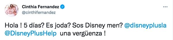 Por último, Fernández le dio un ultimátum: "Te estoy esperando, Disney+, para que te comuniques conmigo. Intenté por redes sociales, teléfono como una pelotud*. Esperé muchas horas, asique dale Disney+, supongo que tiempo y plata tenés", sentenció.
