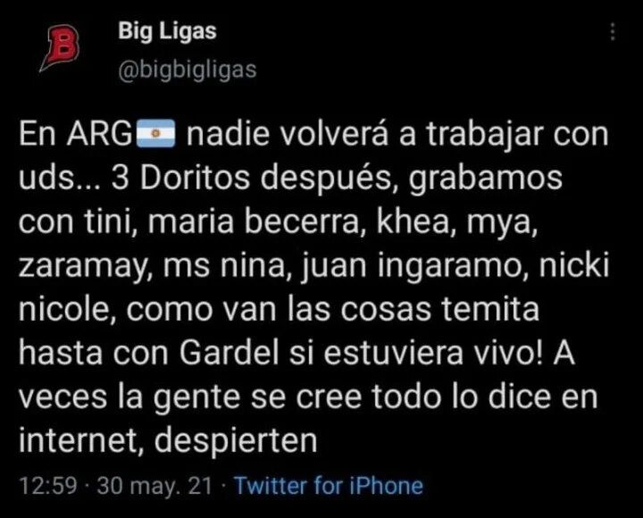 "En Argentina nadie volverá a trabajar con ustedes... 3 Doritos después, grabamos con Tini, María Becerra, Khea, Mya, Zaramay, Ms Nina, Juan Ingaramo, Nicki Nicole", escribieron en la cuenta de Twitter la productora colombiana.