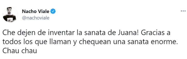 Tras las repercusiones de la noticia, su hermano salió a desmentir la información a través de su cuenta de Twitter. "¡Che, dejen de inventar la sanata de Juana! Gracias a todos los que llaman y chequean una sanata enorme. Chau, chau", escribió este lunes el productor en la red social.