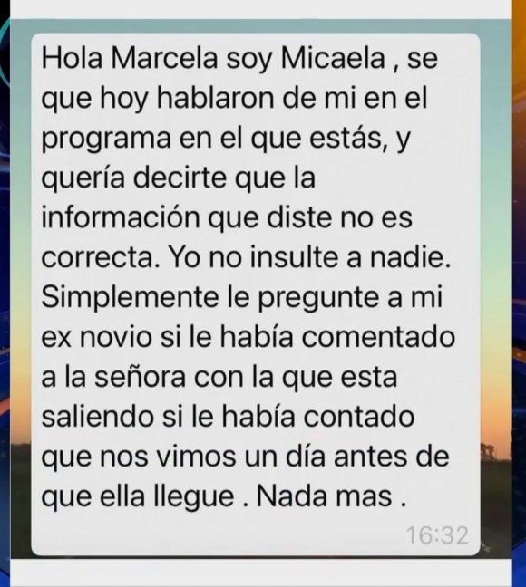 "Hola, Marcela, soy Micaela, sé que hablaron de mí en el programa en el que estás y quería decirte que la información que diste no es correcta. Yo no insulté a nadie, simplemente le pregunté a mi exnovio si le había comentado a la señora con la que está saliendo que nos vimos un día antes de que llegue. Nada más", reza el mensaje que la exnovia de Urcera mandó.