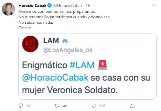 Luego de sus dichos, Ángel de Brito lanzó esta mañana una bomba en LAM. "Quien se casa con su mujer, hace rato que están, es Horacio Cabak. Horacio Cabak se casa con Verónica Soldato", informó. La noticia generó sorpresa en todos los presentes y Pía Shaw, señaló: "No lo esperaba. Muchas veces le pregunté el año pasado a él si tenía ganas de casarse... Ella sí tenía muchas ganas de casarse".