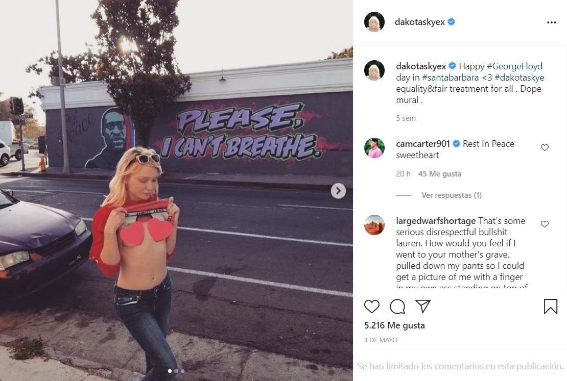La muerte de la actriz se produjo apenas unas semanas después de que Dakota publicara un provocadora foto en topless frente al mural dedicado a George Floyd, el hombre afroamericano que murió tras ser asfixiado por un policía blanco en Minneapolis el 25 de mayo de 2020. "Feliz día de George Floyd. Igualdad y trato justo para todos", compartió en sus redes sociales. Luego de compartir la fotografía, Skye fue acosada y recibió numerosas amenazas.