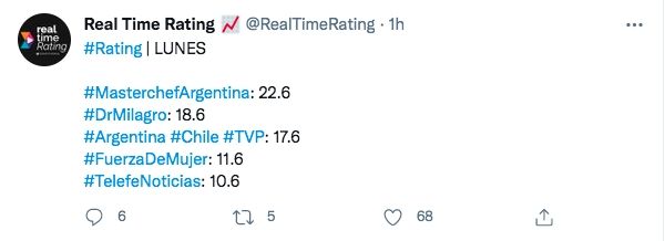 Con respecto a la noche, la novela turca Doctor Milagro (Telefe) sigue imparable con 18.6 puntos contra los 9.8 puntos de ShowMatch (El Trece) con Marcelo Tinelli.
